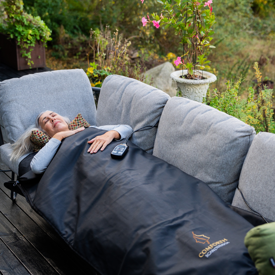 - Anwendung: Legen Sie sich bequem in die Decke, schließen Sie sie um Ihren Körper und entspannen Sie sich, während sich die angenehme Tiefenwärme entfaltet.