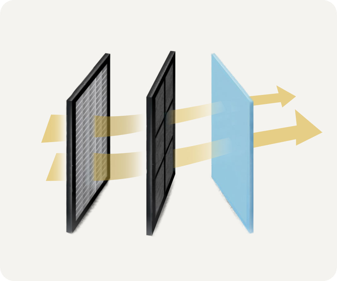 Der HEPA-Filter fängt 99,95% der Partikel so klein wie 0,1 Mikrometer ein. Eine Schicht aus aktiviertem Kohlenstoff entfernt außerdem Gerüche und Gase, einschließlich VOCs.